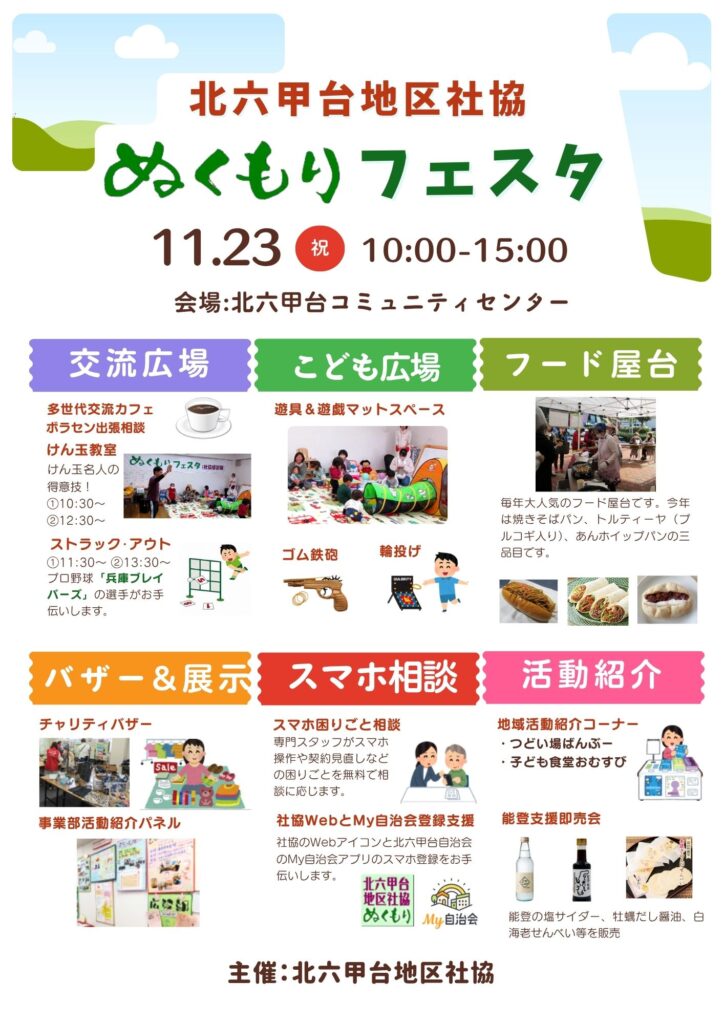 ぬくもりフェスタのポスターができました お知らせ サウンドテーブルテニスのお誘い ぬくもりフェスタのポスターができました スマホ・ホーム画面に社協アイコンを登録 お知らせ【今月の行事と活動】 ぬくもりフェスタ2025 お知らせ【今月の行事と活動】 ぬくもりフェスタのポスターができました 2025.11.16 [北六甲台社協管理人] 23日のフェスタのプログラムポスターができました。 前のページへ戻る
