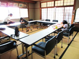 調理場隣りの和室が子ども食堂の会場です。まだ早かったのかスタッフと二人の幼児が思い思いに過ごしていました。8月7日のオープン以降、平均7~8人の子どもたちが利用しているとのことです。
