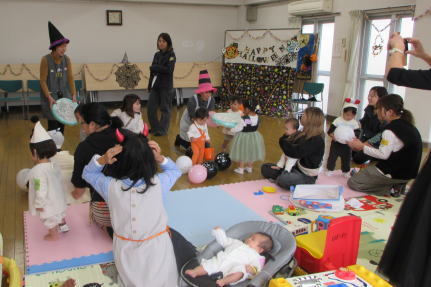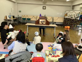 10月の「ともだちつくろう」は、ハロウィンパーティーで賑わいました。スタッフの飾り付けで会場はすっかりハロウィン仕様に変身し、仮装してきてくれたお子さんもいて、いつもと違う雰囲気での開催となりました。参加した親子6組(内、子ども9人)は、風船やパラバルーンで遊んだり、紙芝居を聞いたり‥。最後はお菓子のプレゼントもあり、たくさんの可愛い笑顔が見られました。