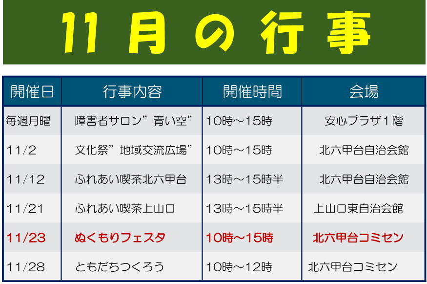 お知らせ【今月の行事と活動】 お知らせ サウンドテーブルテニスのお誘い ぬくもりフェスタのポスターができました スマホ・ホーム画面に社協アイコンを登録 お知らせ【今月の行事と活動】 ぬくもりフェスタ2025 お知らせ【今月の行事と活動】 お知らせ【今月の行事と活動】 2025.11.03 [北六甲台社協管理人] 11月の行事 前のページへ戻る